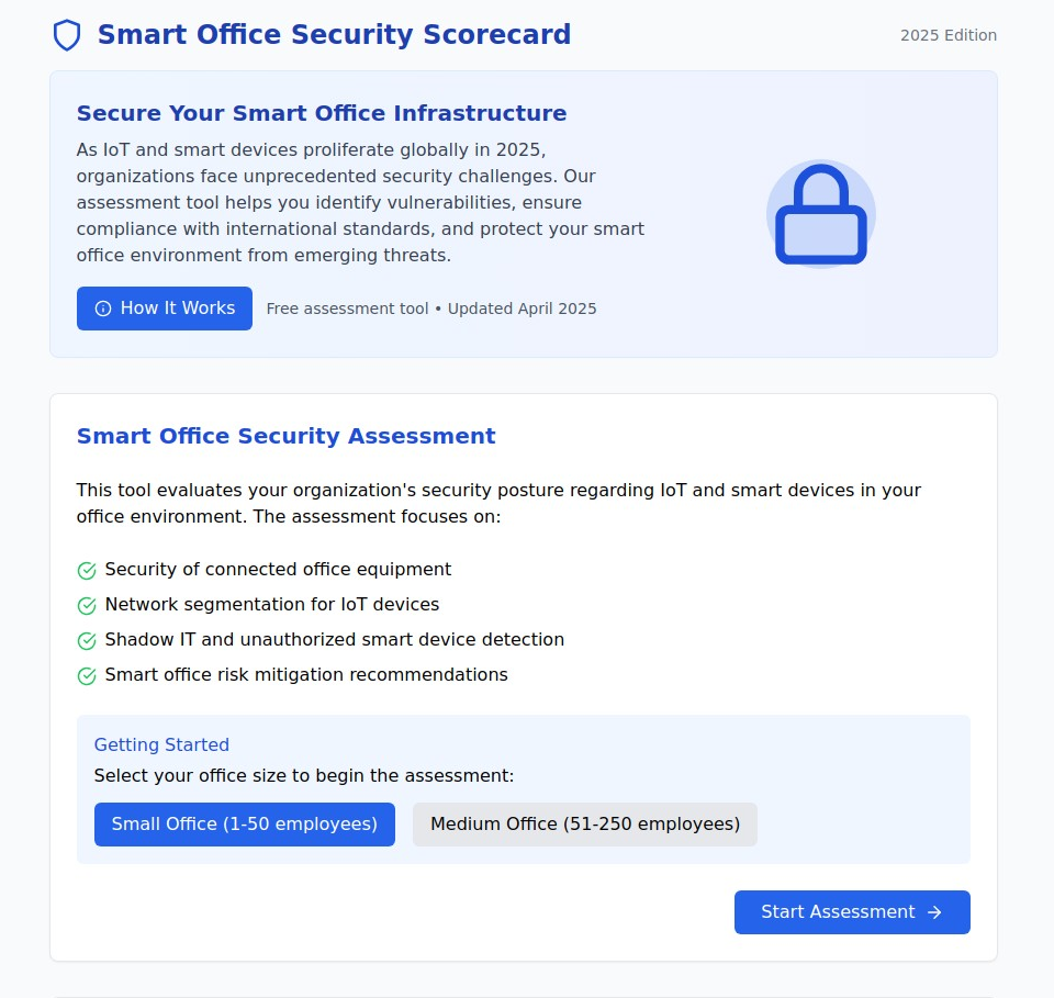 Your smart office security assessment provides the foundation for protecting your connected workplace. In just 10-15 minutes, youâll receive a comprehensive evaluation of your current security posture across all critical areas, along with prioritized recommendations for improvement.