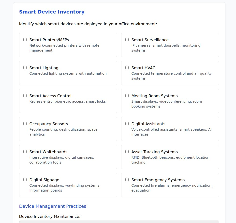 Your smart office security assessment provides the foundation for protecting your connected workplace. In just 10-15 minutes, youâll receive a comprehensive evaluation of your current security posture across all critical areas, along with prioritized recommendations for improvement.